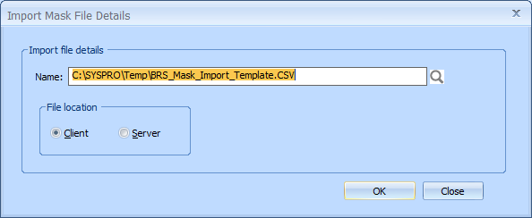 Selecting the “Masks Import” menu option will present the Import Mask File Details window allowing for the Mask import CSV file to be selected and imported.
