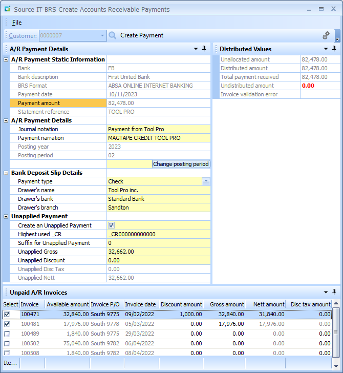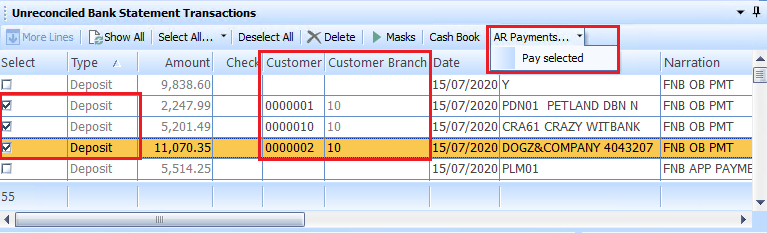 When multiple deposits lines are selected and the “Customer” code, and “Customer Branch” values are specified for each of the selected “Deposit” lines, you may initiate unallocated payments against the specified Customers by selecting the dropdown arrow next to the “AR Payments…” button and the selecting the “Pay Selected” button. Only available when Function is set to “Process” mode.