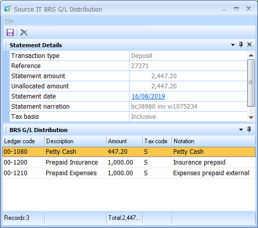 GL Codes button will allow for the specification of an unlimited number of General Ledger codes to distribute the selected transaction value against. The Unreconciled Bank Statement Transaction listview allows for the first General Ledger distribution details to be entered and this GL Codes button will call a new BRS G/L Distribution capture program to be called accordingly. See the GL Distribution Codes capture process below.