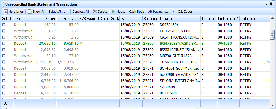 Show All: will retrieve and load ALL of the unreconciled Cash Book transactions into the listview. The button is deactivated when all available transactions have been listed.