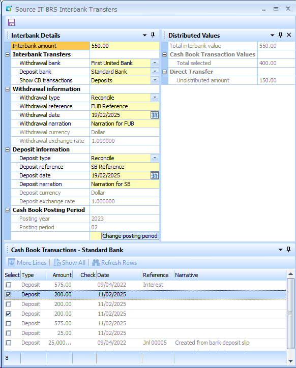 Distributed Values: this window displays the details regarding the captured value and any Cash Book Transactions involved with this Interbank Transfer.