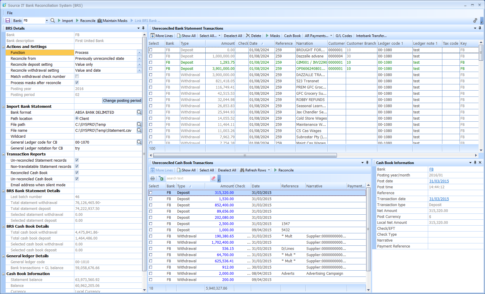 When this listview is loaded, the first 100 unreconciled Cash Book transactions will be listed. Selecting an entry in the list view will display the additional Cash Book details in the “Cash Book Information” screen.
